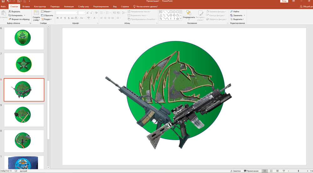Замечаешь стертую часть окантовки круга слева вверху? Автомат и микроскоп мальца не симметрично расположены относительно вертикальной оси герба. Как вариант - немного "положить" или автомат, или микроскоп вправо градусов на 5-10, чтобы они были под одним углом наклона относительно центральной оси. Возможно будет смотреться лучше. У микроскопа верхняя черная часть подрезана наискосок, а он не такой же на самом деле. Атомные орбиты я бы сделал чуть тоньше и менее пиксельными - смотрятся не айс. И можно попробовать вытащить на передний план ленту с названием группировки - глянуть как будет смотреться без "пропажи" части букв. И еще: мне как полуслепому и смотрящему на проект без очков (когда всё полуразмыто) кажется, что если сравнять по градиенту общий фон круга и фон герба с лебедями, то будет вообще хорошо. Сейчас они не одноцветны и имеется заметная окантовка исходного герба, проступающая на голубом фоне круга. Сообщение отредактировал IMAGINE - Среда, 01.04.2026, 19:00 |
