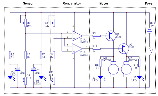 Это схема машинки, которая ездит по нарисованной линии (оптика)
